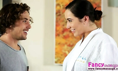 Sexy well stuck brunette masseuse takes shower with nerdy buddy