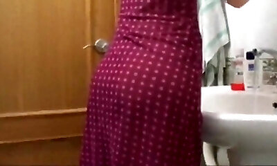My step-mom is washing the bathroom, she lets me bathe while she finishes, I am successful and I ask her to pummel.