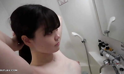 Her Japanese hairy snatch gets penetrated and creampied after a bathroom