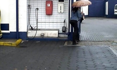 dayna vendetta se dirige vers la salle de bain d'une station-service pendant que son petit ami pompe de l'essence dans le camping-car