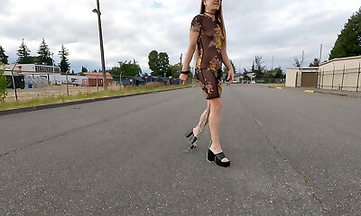 longpussy, pour une promenade dans mon style habituel, bouchon de fesses, micro-jupe courte, chaussures à talons hauts, hauts de hanche avec mes pare-chocs attachés