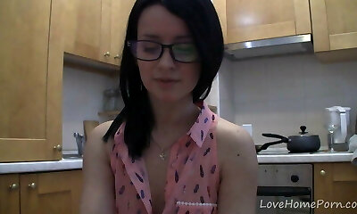 Chubby dark haired chick in glasses fucks her kitty with faux corn at kitchen