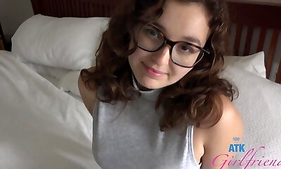 Nerdy girl with glasses is curious about an experienced fellow's dick