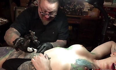Huge-titted Marie Bossette masturbates while getting a tattoo