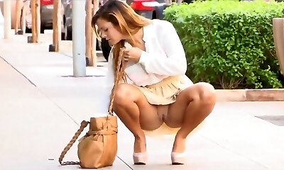 Slutty and naughty asian chick walks outside in short dress